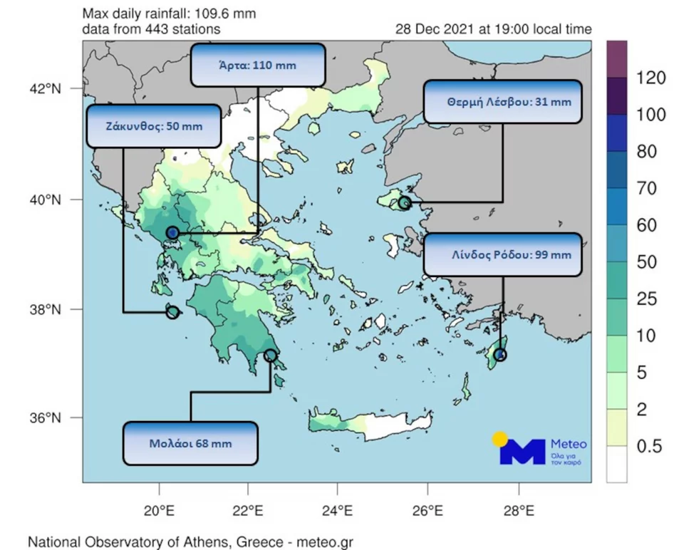 Στον χάρτη που ακολουθεί παρουσιάζεται η γεωγραφική κατανομή των βροχοπτώσεων έως τις 19:00 τοπική ώρα, σύμφωνα με 443 μετεωρολογικούς σταθμούς του δικτύου αυτόματων μετεωρολογικών σταθμών του Εθνικού Αστεροσκοπείου Αθηνών και επισημαίνονται οι σημαντικότερες καταγραφές.