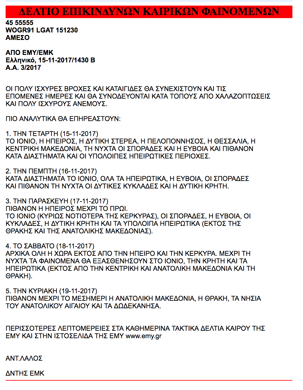 – Την Παρασκευή (17-11-2017) πιθανόν η Ήπειρος μέχρι το πρωί. Το Ιόνιο (κυρίως νοτιότερα της Κέρκυρας), οι Σποράδες, η Εύβοια, οι Κυκλάδες, η Δυτική Κρήτη και τα υπόλοιπα ηπειρωτικά (εκτός της Θράκης και της Ανατολικής Μακεδονίας).