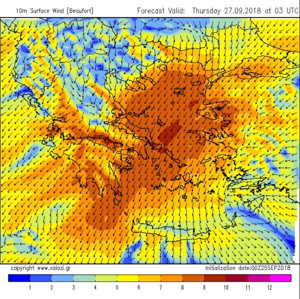 Την Παρασκευή και το Σάββατο οι άνεμοι θα ενισχυθούν σημαντικά στο Νότιο Ιόνιο, τη Δυτική και Νότια Ελλάδα καθώς και στην Κρήτη, με την ένταση τους να φτάνει στο Νότιο Ιόνιο, το Κρητικό πέλαγος και τη θάλασσα των Κυθήρων τα 10 και πιθανόν τα 11 μποφόρ! Στις υπόλοιπες ηπειρωτικές περιοχές της Νότιας χώρας, οι άνεμοι θα ενισχυθούν σημαντικά φτάνοντας στην Πελοπόννησο τα 9 μποφόρ.