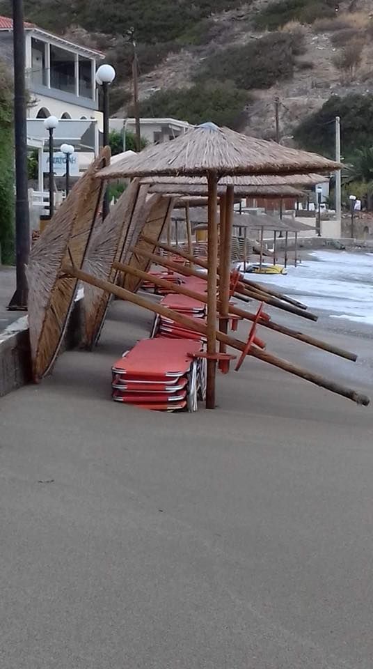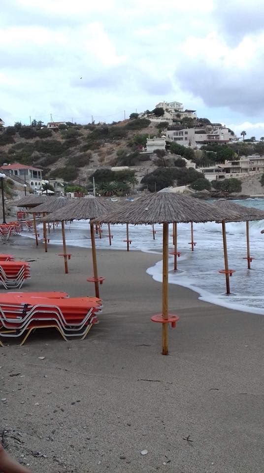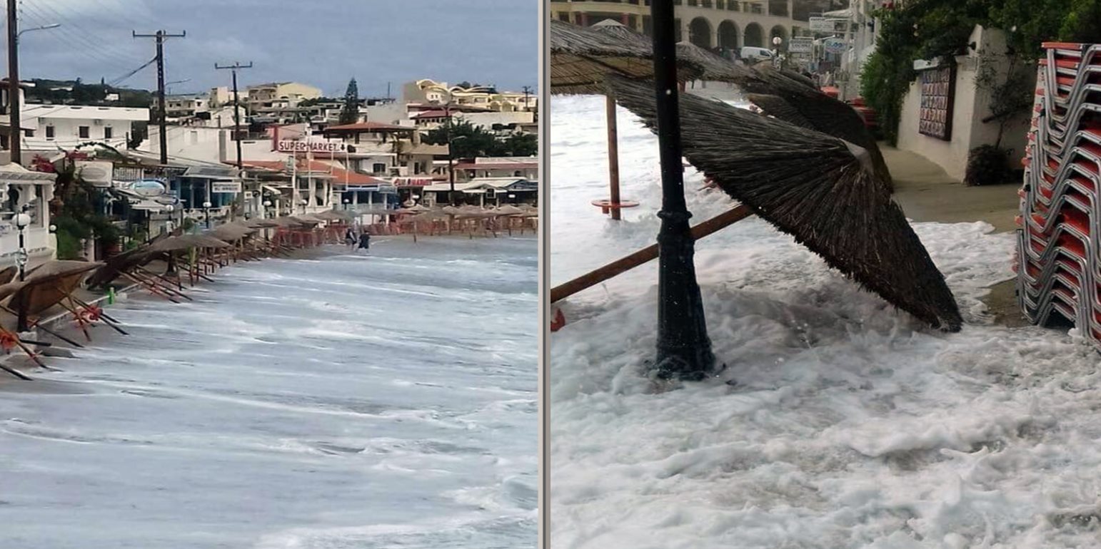 Ο «Ξενοφών» έφτασε και στην Κρήτη και εξαφάνισε τις παραλίες στο νησί. Η θάλασσα στην κυριολεξία κατάπιε την ακτή. Ακόμα και οι ξαπλώστρες με τις ομπρέλες «κολυμπούσαν» στα κύματα.