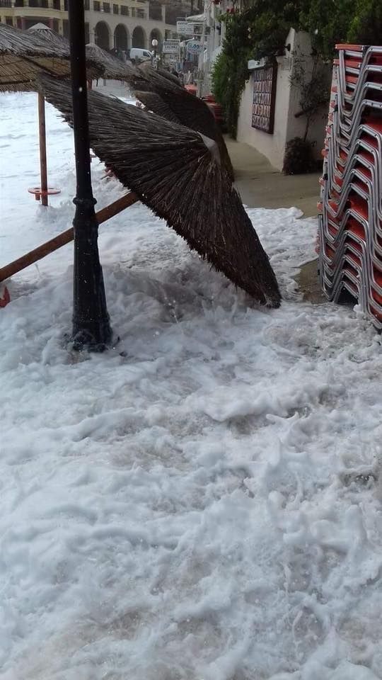 Συγκεκριμένα η παραλία της Αγιάς Πελαγίας…δεν υπάρχει…πια! Όπως θα δείτε και στις παρακάτω φωτογραφίες που τράβηξε επιχειρηματίας της περιοχής, οι ομπρέλες και οι ξαπλώστρες έχουν απομακρυνθεί και η φουσκωμένη θάλασσα «γλύφει» τους τοίχους των καταστημάτων που βρίσκονται κατά μήκος της ακτής.