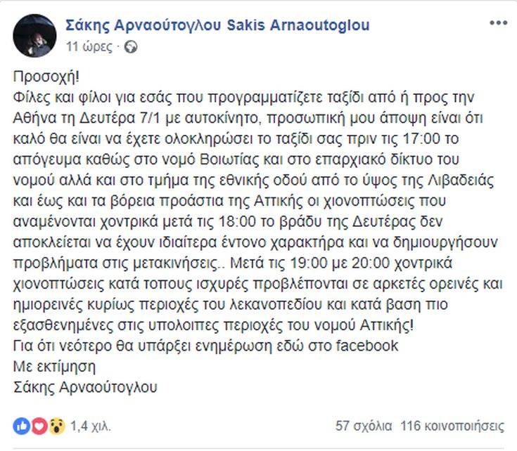 Προειδοποίηση για όσους ταξιδεύουν προς Αττική ή σκέφτονται να φύγουν από αυτήν απηύθυνε πριν από λίγο ο γνωστός εμπειρικός μετεωρολόγος Σ.Αρναούτογλου.