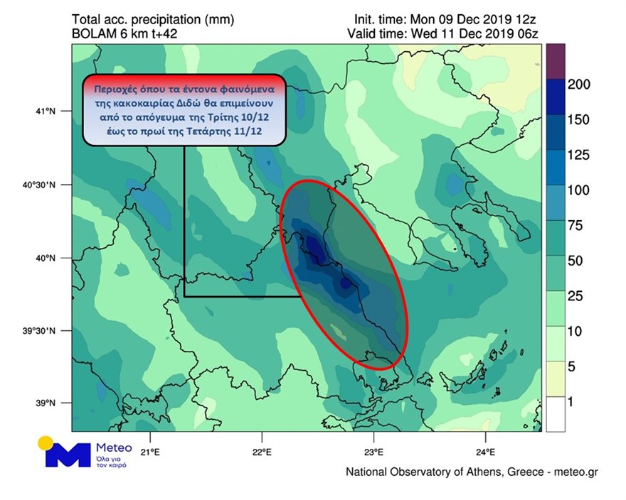 Ιδιαίτερη προσοχή θα πρέπει να δοθεί από τις απογευματινές ώρες της Τρίτης έως και τις πρωινές ώρες της Τετάρτης κυρίως στα παράκτια τμήματα της Ανατολικής Θεσσαλίας, της Πιερίας και της Ημαθίας όπου λόγω του πολύ ενισχυμένου ανατολικού ρεύματος που θα πνέει στο Βόρειο Αιγαίο με εντάσεις 8-9 μποφόρ, οι έντονες βροχοπτώσεις θα έχουν μεγάλη διάρκεια,