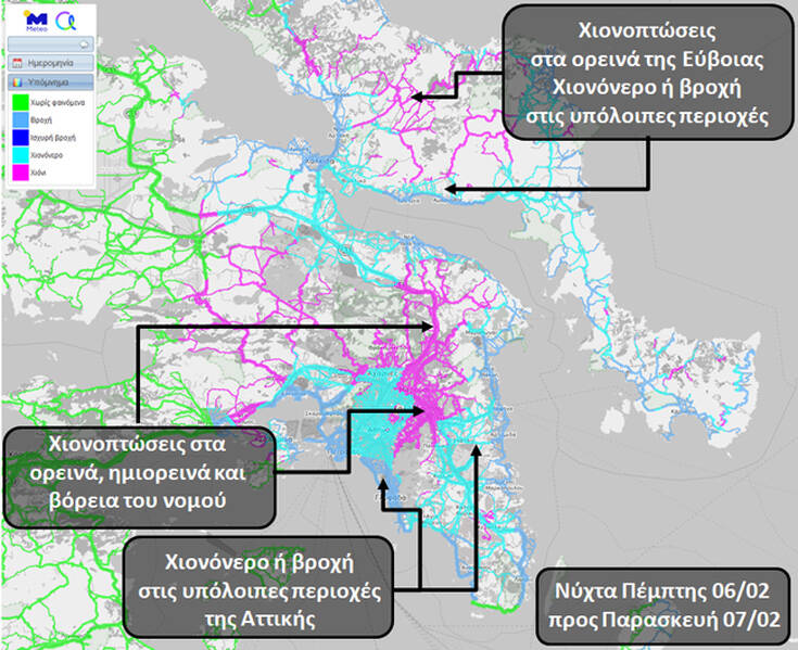 Χιονοπτώσεις θα σημειωθούν σε μεγάλο μέρος του οδικού δικτύου της Βόρειας Αττικής και της Εύβοιας, ενώ χιονόνερο ή βροχή αναμένεται στις υπόλοιπες περιοχές της Αττικής.