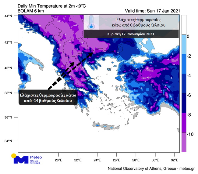 (Αρχικό κείμενο 19:38) Σύμφωνα με τα τελευταία προγνωστικά δεδομένα του Εθνικού Αστεροσκοπείου Αθηνών / meteo.gr, αύριο Κυριακή 17 Ιανουαρίου, αναμένεται να επικρατήσουν πολικές θερμοκρασίες τις πρωινές ώρες.