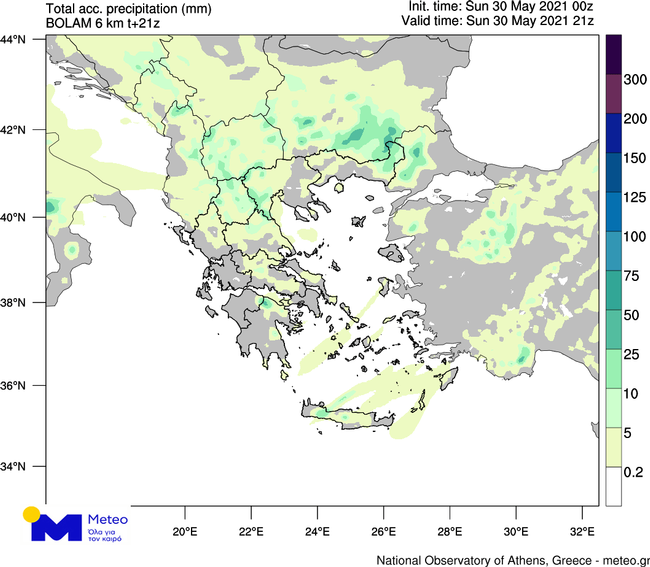 Όμως, σύμφωνα με τα τελευταία προγνωστικά στοιχεία του Εθνικού Αστεροσκοπείου Αθηνών / meteo.gr, για την Κυριακή 30/05 προβλέπονται λίγες νεφώσεις παροδικά αυξημένες με τοπικές καταιγίδες στα ηπειρωτικά τις θερμές ώρες της ημέρας, ενώ τοπικές βροχές αναμένονται σε θαλάσσιες ή παραθαλάσσιες περιοχές της Κρήτης, των Κυκλάδων, της Βόρειας και Ανατολικής Πελοποννήσου και της Εύβοιας (Χάρτης 2). Επίσης αργά το απόγευμα της Κυριακής, οι άνεμοι στο Βόρειο Αιγαίο και το Ιόνιο θα ενισχυθούν και θα φτάσουν τοπικά τα 5-6 Μποφόρ.