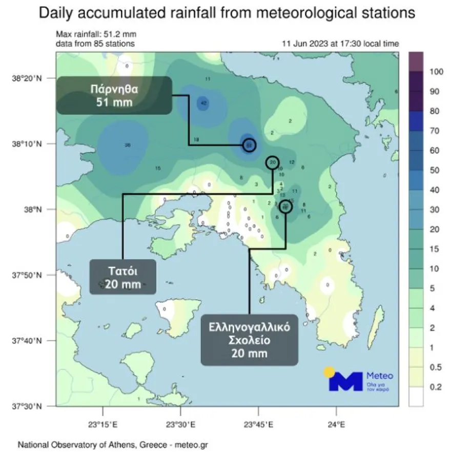 Πιο συγκεκριμένα, στο μετεωρολογικό σταθμό του Εθνικού Αστεροσκοπείου Αθηνών/ meteo.gr στην Πάρνηθα σημειώθηκαν 51 χιλιοστά βροχής σε χρονικό διάστημα σχεδόν 2 ωρών.