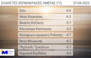 Στην Μακεδονία και τη Θράκη, η Δευτέρα 7 Απριλίου ξημέρωσε με συνθήκες παγετού, καθώς οι θερμοκρασίες έφτασαν σε αρνητικές τιμές, ακόμα και σε περιοχές χαμηλού υψομέτρου. Οι θερμοκρασίες του πρωινού καταγράφηκαν σε εξαιρετικά χαμηλά επίπεδα, με το Σέλι να σημειώνει το χαμηλότερο, αγγίζοντας τους -6,9°C. Ακολουθούν οι περιοχές του Νέου Καυκάσου και της Βλάστης Κοζάνης, με αντίστοιχες θερμοκρασίες -6,3°C και -5,7°C.
