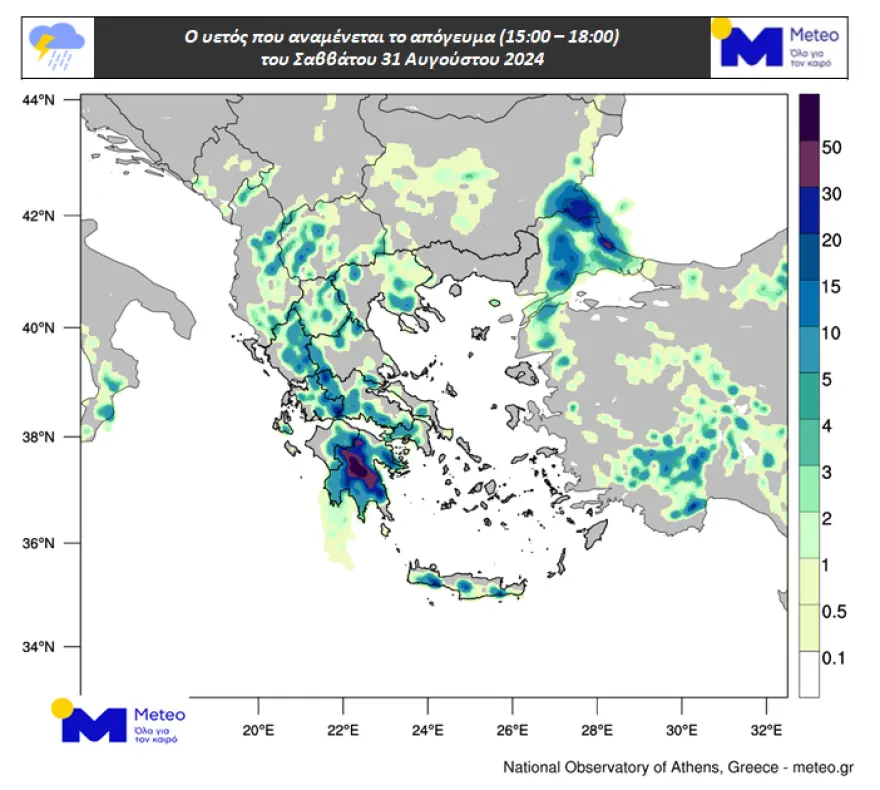 Στους χάρτες που ακολουθούν παρουσιάζεται ο υετός που αναμένεται το μεσημέρι και το απόγευμα του Σαββάτου 31/08.