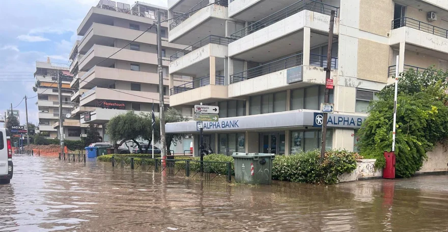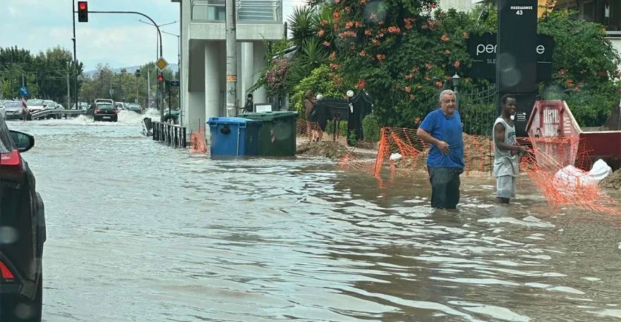 Στη συμβολή της Ποσειδώνος με την Καλαμακίου έχει πλημμυρίσει το οδόστρωμα και οι τρεις λωρίδες γίνονται μία, με αποτέλεσμα να έχει προκληθεί μποτιλιάρισμα.