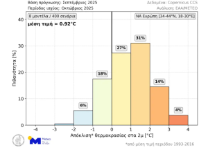 Χάρτης απόκλισης της μέσης θερμοκρασίας Οκτωβρίου 2025 από τη μέση τιμή του 1993-2016, σύμφωνα με την μέση τιμή των 400 μακροπρόθεσμων προγνώσεων που εκδόθηκαν αρχές Σεπτεμβρίου