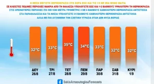 Θερμοκρασία: Από 24 έως 33 με 34 βαθμούς Κελσίου. Στα ανατολικά η μέγιστη θα είναι 2 με 3 βαθμούς χαμηλότερη.