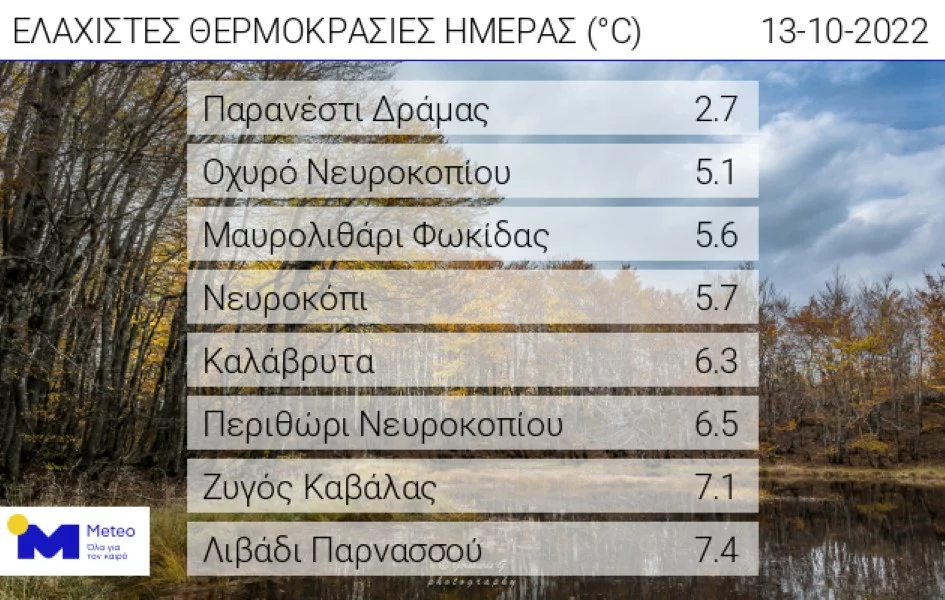 Σύμφωνα με το δίκτυο αυτόματων μετεωρολογικών σταθμών του Εθνικού Αστεροσκοπείου Αθηνών / meteo.gr, η ελάχιστη θερμοκρασία καταγράφηκε στο Παρανέστι Δράμας και ήταν ίση με 2.7 βαθμούς Κελσίου.