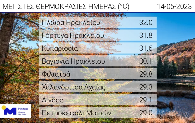 Όπως φαίνεται στον σχετικό πίνακα που παρουσιάζει τους 8 σταθμούς του δικτύου αυτόματων μετεωρολογικών σταθμών του Εθνικού Αστεροσκοπείου Αθηνών / meteo.gr, η μέγιστη θερμοκρασία την Κυριακή 14/05 καταγράφηκε στην Πλώρα Ηρακλείου και ήταν ίση με 32 βαθμούς Κελσίου.