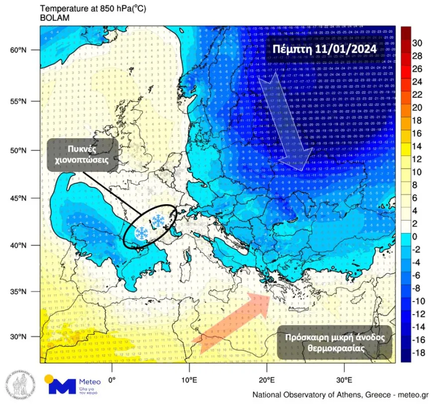 «Διατηρούνται οι χαμηλές θερμοκρασίες μέχρι την Κυριακή. “Μίζερη” από πλευράς χιονοπτώσεων θα είναι η δεύτερη ψυχρή εισβολή η οποία θα μας απασχολήσει το διήμερο Παρασκευής 12/1 -Σάββατο 13/1. Ωστόσο η θερμοκρασία θα σημειώσει πτώση έως 8 βαθμούς σε σχέση με την αυριανή ημέρα , και τα χιόνια θα κατέβουν και σε χαμηλά υψόμετρα στο Πήλιο, την Εύβοια, τη Βοιωτία και την Αττική (300-400 μέτρα). Στην Πελοπόννησο και τη Φθιώτιδα μέχρι τα 700 μέτρα. Επίσης θα χιονίσει και στα ορεινά της Κρήτης. Από τη Δευτέρα ο υδράργυρος θα αρχίσει να παίρνει πάλι την ανηφόρα» γράφει στην ανάρτησή του ο Γιώργος Τσατραφύλλιας.