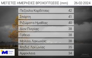 Από τα μεσάνυχτα της Κυριακής 25/2 έως τις 8 π.μ. της Δευτέρας 26/2, τα μεγαλύτερα ύψη βροχής σημειώθηκαν.