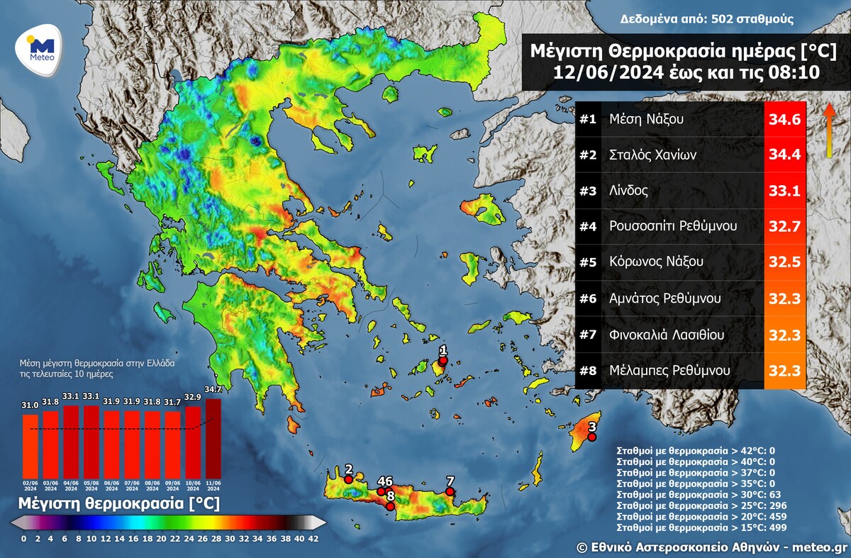 Παράλληλα, 63 από τους 502 ενεργούς σταθμούς (την παρούσα χρονική στιγμή) κατέγραψαν την ίδια ώρα θερμοκρασίες άνω των 30°C.