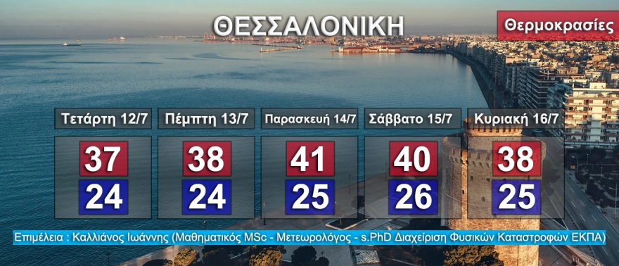 Ελαφρώς πιο χαμηλές θερμοκρασίες στη Θεσσαλονίκη, όπου τα μέγιστα όρια αναμένεται ότι θα αγγίξουν τους 41 βαθμούς την Παρασκευή, τους 40 το Σάββατο και τους 38 την Κυριακή.
