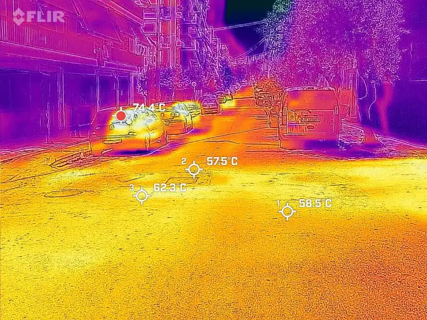 Μάλιστα, ακόμα πιο υψηλές θερμοκρασίες «έπιασε» η θερμική κάμερα στην άσφαλτο και πάνω στα αυτοκίνητα.