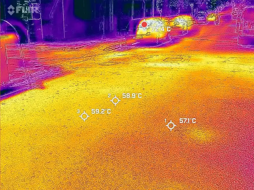 Μάλιστα, ακόμα πιο υψηλές θερμοκρασίες «έπιασε» η θερμική κάμερα στην άσφαλτο και πάνω στα αυτοκίνητα.