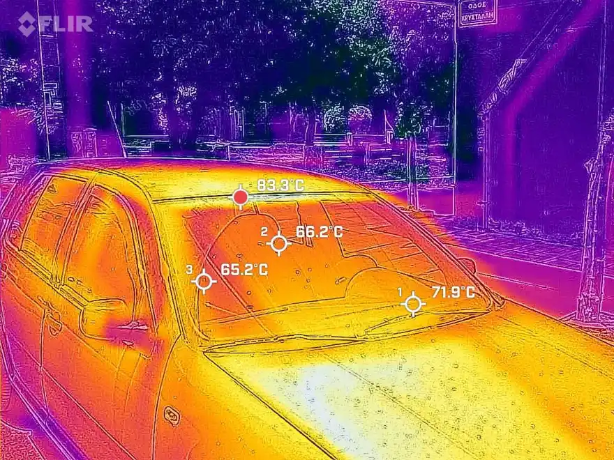 Όπως δείχνουν, στην οροφή του αυτοκινητού φαίνεται να είναι στους 84 βαθμούς Κελσίου ενώ στα πλαϊνά φτάνει μέχρι τους 70,1 βαθμούς. Σε άλλη φωτογραφία, η θερμοκρασία στην άσφαλτο κυμαίνεται από 57,5 βαθμούς ως 62,3 βαθμούς.