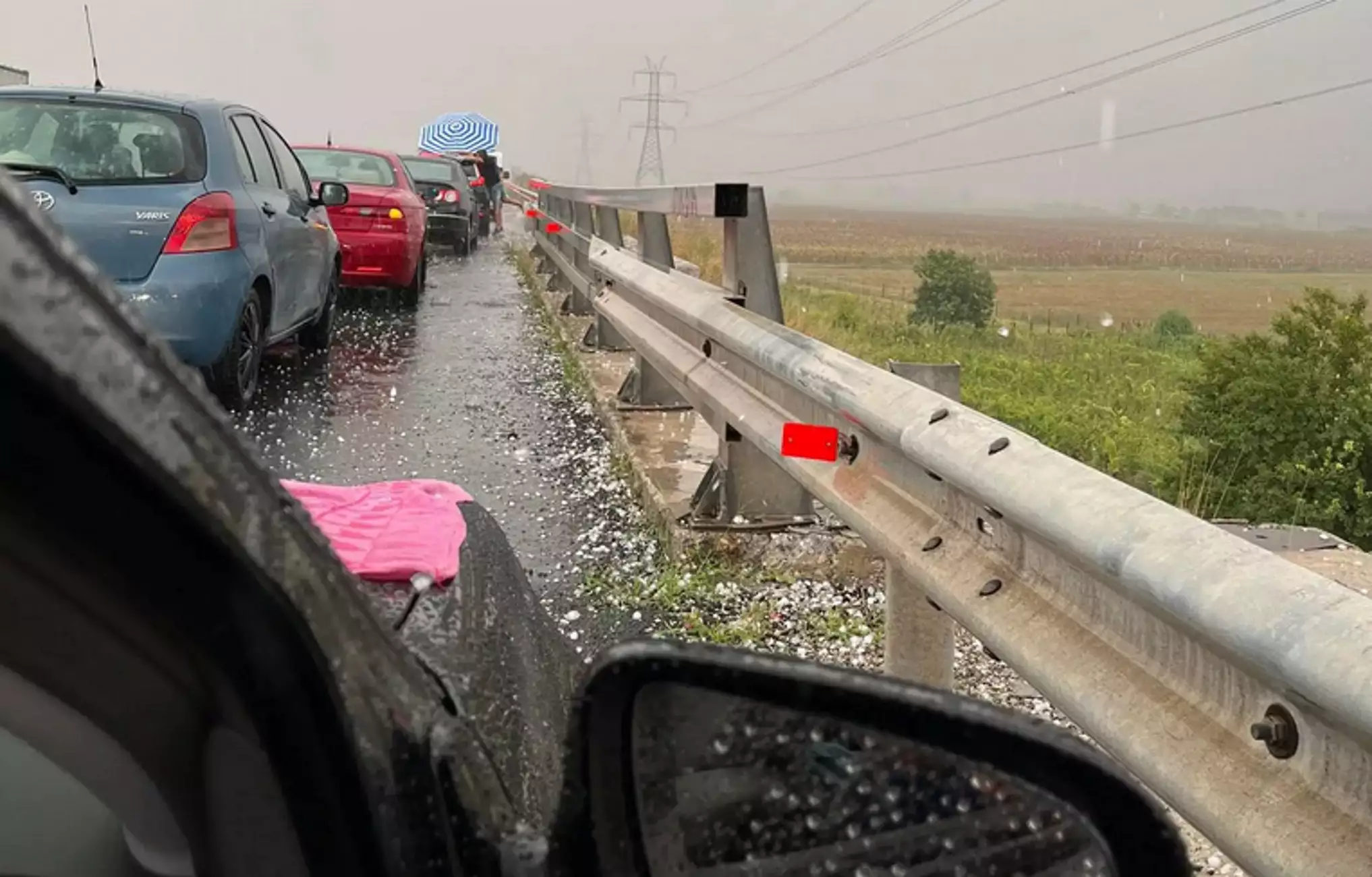 Σφοδρό χαλάζι και ουρές οχημάτων στα διόδια Πολυμύλου, της Εγνατίας Οδού, λίγο μετά τις 20:00 με τους οδηγούς και τους επιβάτες να αναμένουν για αρκετά λεπτά για να περάσουν.