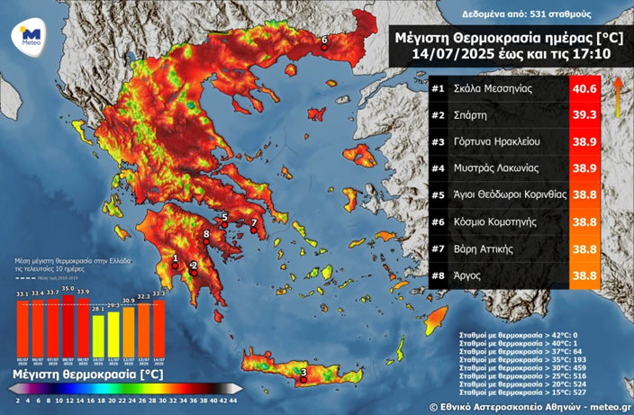Σύμφωνα με το Meteo, η μέγιστη θερμοκρασία καταγράφηκε στη Σκάλα Μεσσηνίας με 40,6 βαθμοί Κελσίου και ακολούθησαν η Σπάρτη με 39,3 βαθμούς και η Γόρτυνα Ηρακλείου με 38,9 βαθμούς.