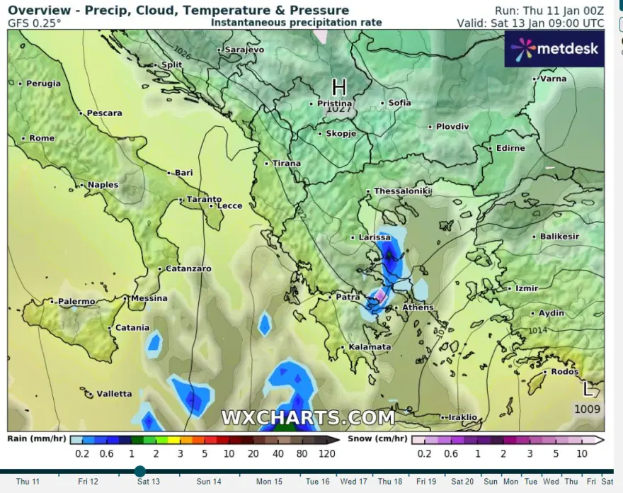 Το σύστημα αυτό θα επηρεάσει τη χώρα μας το Σάββατο. Πιο πρίν θα επηρεαστούμε από το αβαθές χαμηλό της Κεντρικής Μεσογείου την Παρασκευή με πολλές βροχές στα δυτικά τα κεντρικά και τα νότια και χιόνια στα ορεινά.