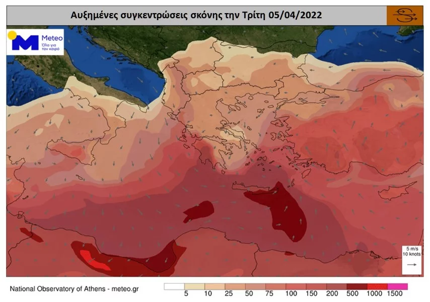 Στον προγνωστικό χάρτη που ακολουθεί παρουσιάζεται η διασπορά της σκόνης στην ατμόσφαιρα κατά τη διάρκεια της Τρίτης 05/04.