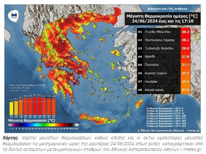 Σύμφωνα με τη χρωματική κλίμακα θερμοκρασιών στον χάρτη του δικτύου δίκτυο αυτόματων μετεωρολογικών σταθμών του Εθνικού Αστεροσκοπείου Αθηνών / meteo.gr, 149 μετεωρολογικοί σταθμοί κατέγραψαν μέγιστες θερμοκρασίες άνω των 35°C.
