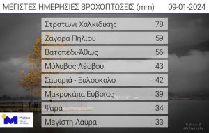 Σύμφωνα με το Αστεροσκοπείο Αθηνών, τα μεγαλύτερα ύψη βροχής έπεσαν στη Χαλκιδική, όπου προκλήθηκαν και ζημιές.