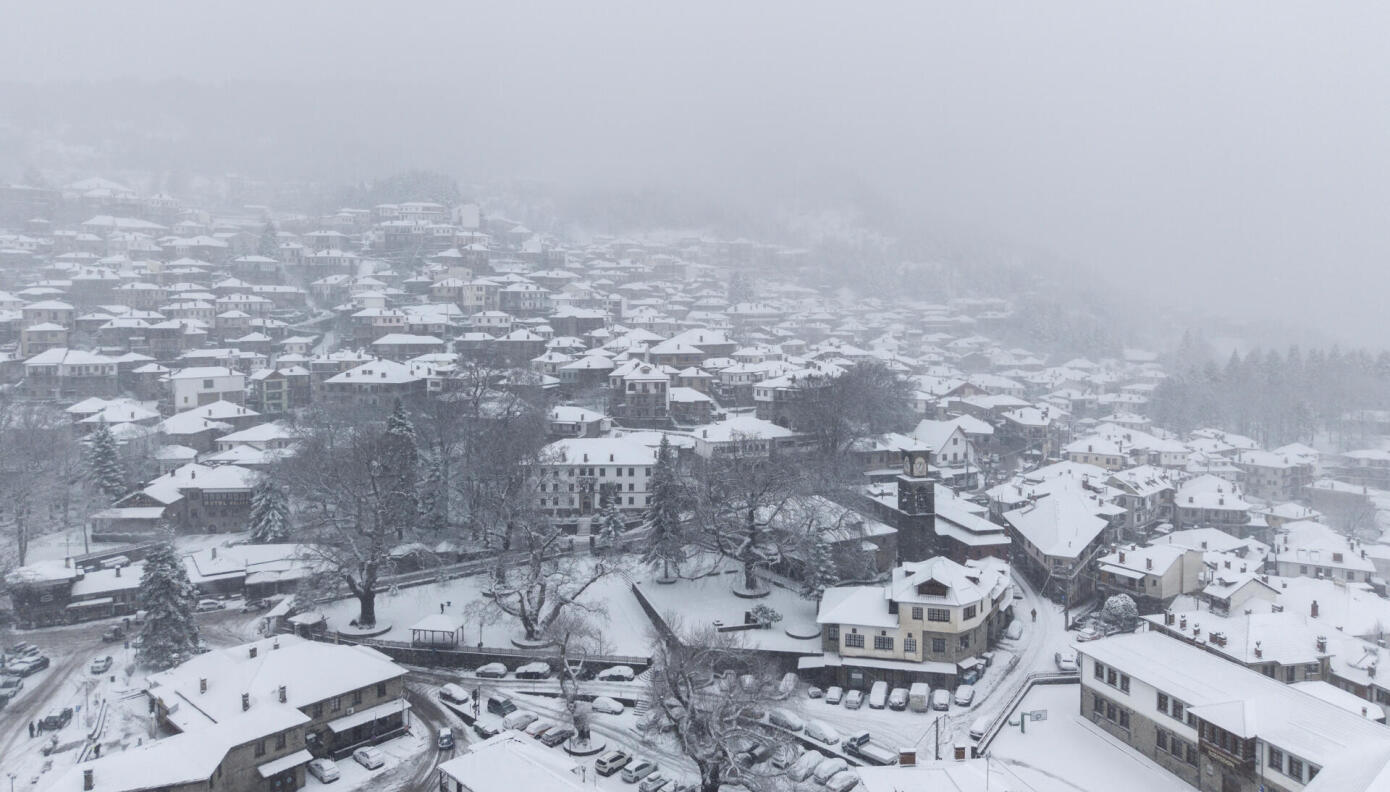 Η έντονη χιονόπτωση έχει καλύψει τα πέτρινα σπίτια και τους δρόμους.