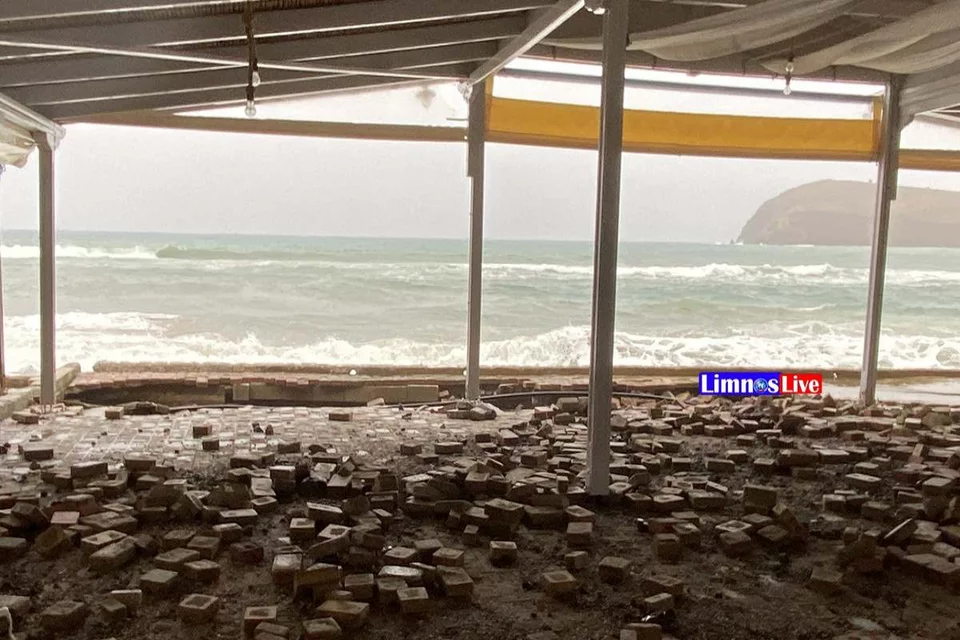 Η κακοκαιρία «Bettina», προκάλεσε σοβαρές ζημιές, ακόμη και στο δάπεδο της πλατείας στη Λήμνο.