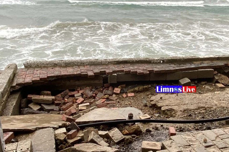 Ήταν τόσο ισχυρά τα φαινόμενα, που ξηλώθηκαν τα τούβλα με τα οποία έχει «ντυθεί» ο πεζόδρομος στην παραλία, ενώ άνοιξαν ακόμη και τρύπες στο οδόστρωμα.