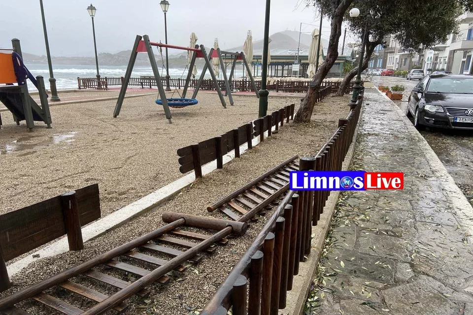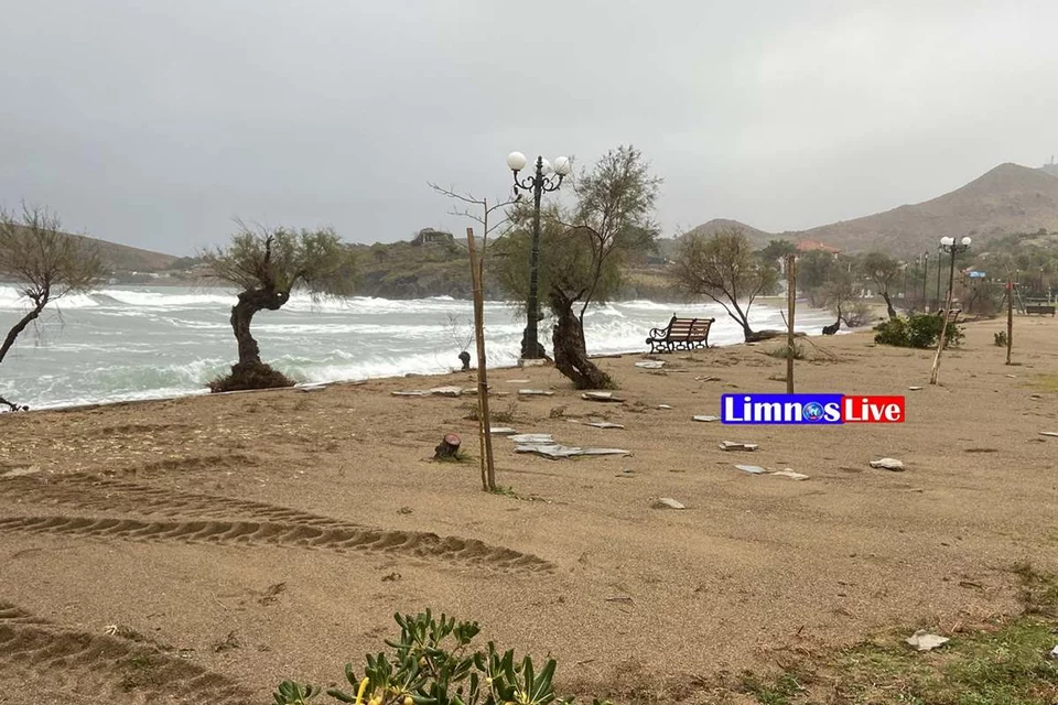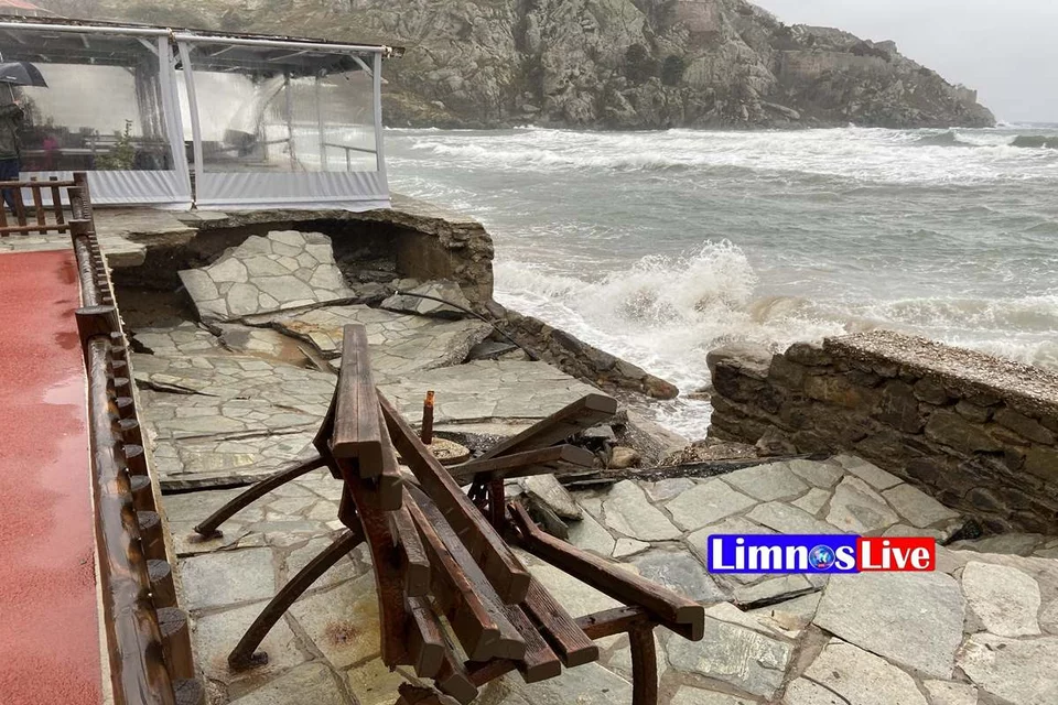 Οι σφοδροί άνεμοι που ξεπέρασαν τα 8 μποφόρ, προκάλεσαν ζημιά σε όλο το μέτωπο της παραλιακής στη Μύρινα κατά την διάρκεια της νύχτας.