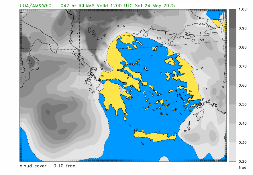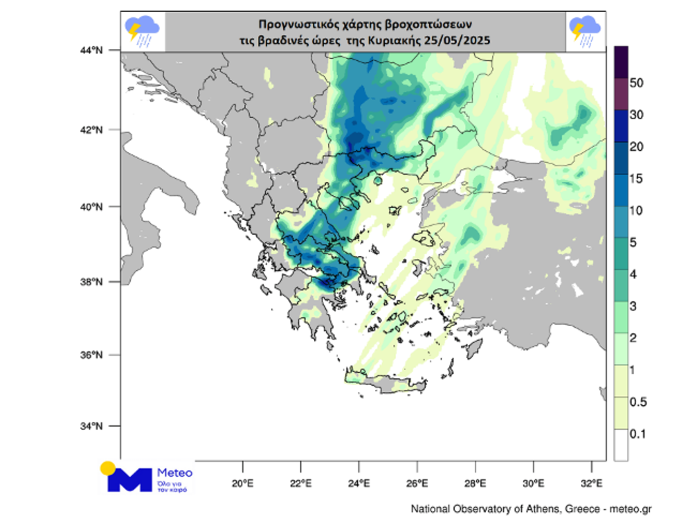 δ. Στην ανατολική Μακεδονία, στη Θράκη και στο βορειοανατολικό Αιγαίο από νωρίς το βράδυ μέχρι τις πρώτες πρωινές ώρες της Δευτέρας (26/5).
