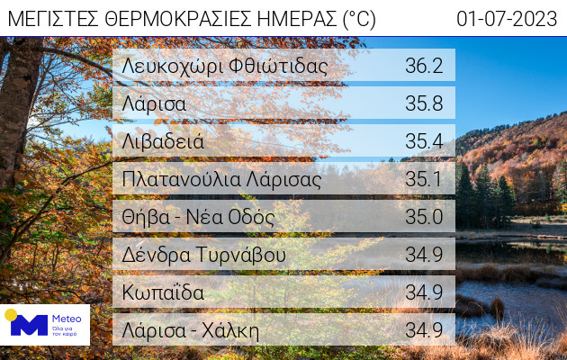 Σύμφωνα με το δίκτυο αυτόματων μετεωρολογικών σταθμών του Εθνικού Αστεροσκοπείου Αθηνών / meteo.gr, αρκετή ζέστη επικράτησε στη χώρα σήμερα Σάββατο, με τις μέγιστες θερμοκρασίες να φτάνουν στους 35-36 βαθμούς Κελσίου σε περιοχές της Θεσσαλίας και της Στερεάς Ελλάδας.