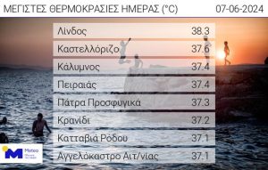 Σύμφωνα με το meteo, η μέγιστη θερμοκρασία σημειώθηκε στη Λίνδο, και ήταν ίση με 38.3 °C.