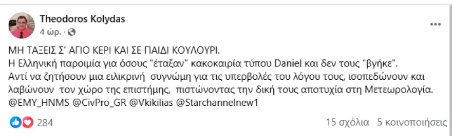 Στην ανάρτηση του εξαπέλυσε σφοδρή επίθεση στους συναδέλφους του γιατί όλοι έβγαιναν εν χορώ και προέβλεπαν μία κακοκαιρία τύπου Daniel , λέγοντας χαρακτηριστικά ότι «αντί να ζητήσουν μια ειλικρινή συγνώμη για τις υπερβολές του λόγου τους, ισοπεδώνουν και λαβώνουν τον χώρο της επιστήμης».