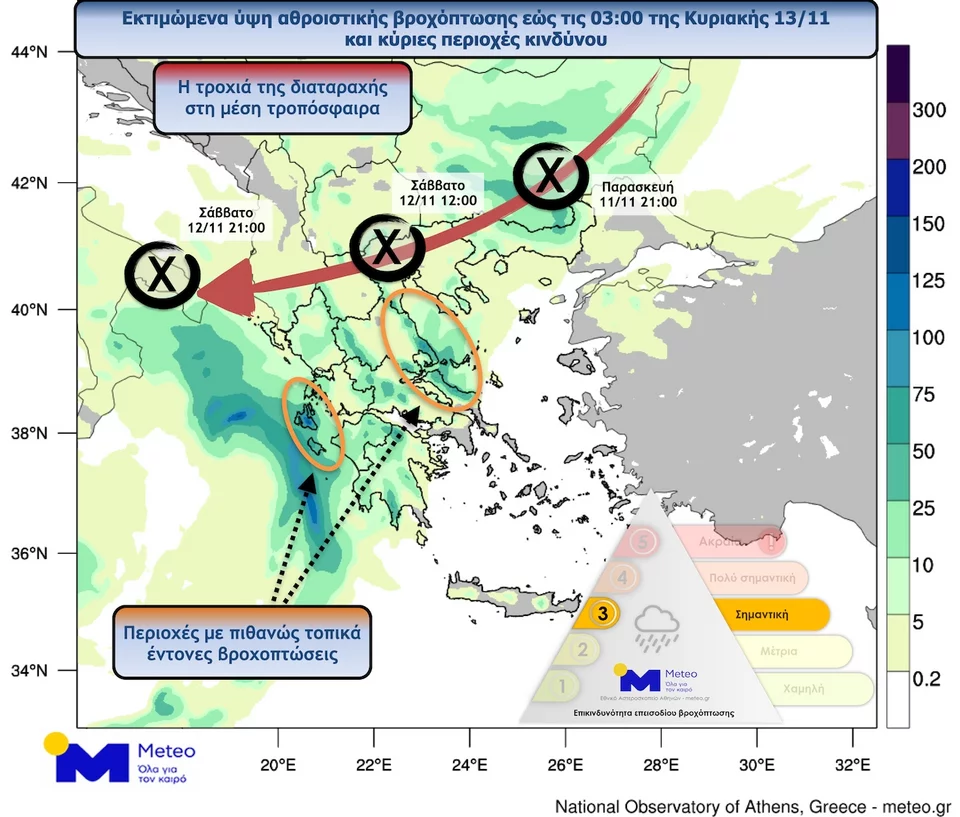 Όσον αφορά τον Δείκτη Επικινδυνότητας Επεισοδίου Βροχόπτωσης (Regional Precipitation Index – RPI), το επεισόδιο βροχόπτωσης αναμένεται να είναι Κατηγορίας 3 το Σάββατο (12/11).