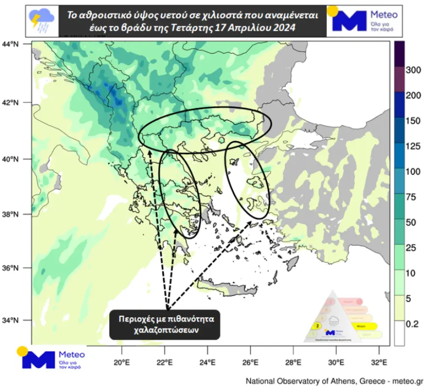 Στον χάρτη της Εικόνας 1 παρουσιάζεται το αθροιστικό ύψος υετού σε χιλιοστά που αναμένεται έως το βράδυ της Τετάρτης 17/04.