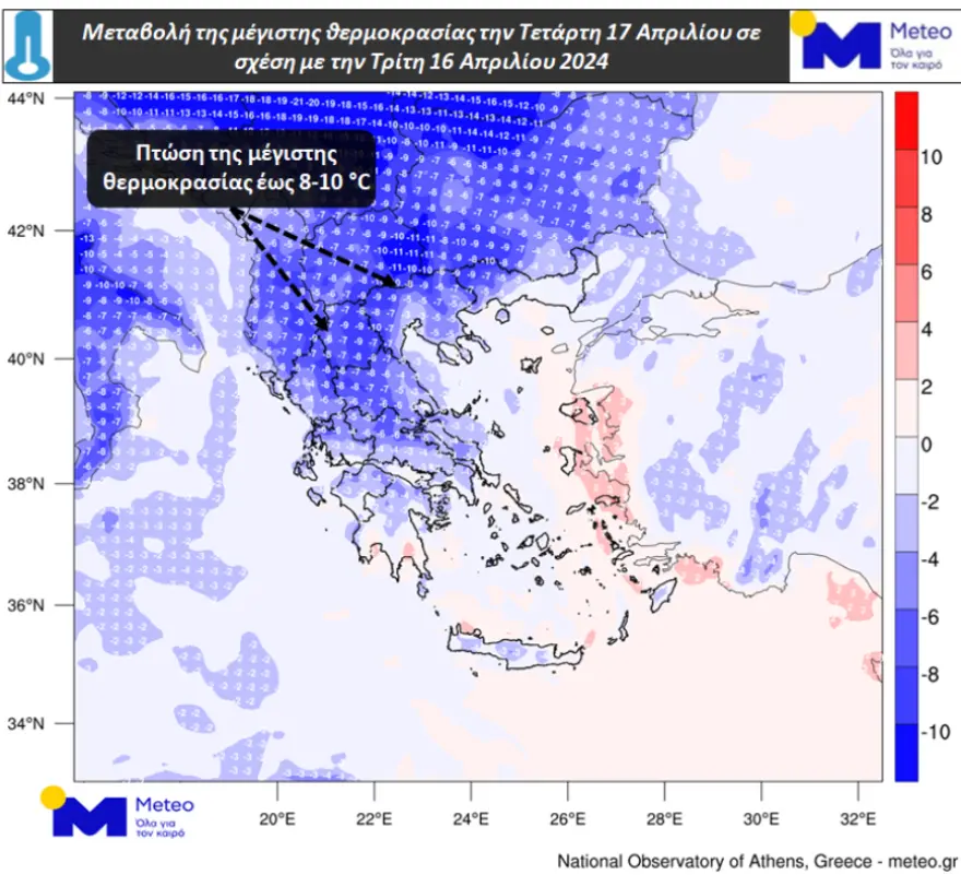Η θερμοκρασία θα παρουσιάσει πτώση της τάξης των 2 έως 4 °C την Τρίτη 16/04 ενώ την Τετάρτη 17/04 η πτώση της στα βόρεια ηπειρωτικά θα φτάσει κατά τόπους τους 8 έως 10°C και στα υπόλοιπα ηπειρωτικά τους 4 έως 8 °C υποχωρώντας στα κανονικά για την εποχή επίπεδα.