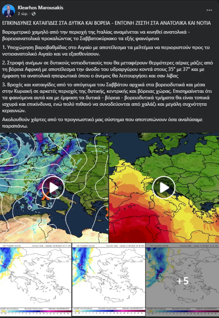 Ο μετεωρολόγος Κλέαρχος Μαρουσάκης, με ανάρτησή του στα μέσα κοινωνικής δικτύωσης προειδοποιεί για μεταβολή του καιρού το Σαββατοκύριακο λόγω βαρομετρικού χαμηλού που κινείται από την Ιταλία προς τα ανατολικά.