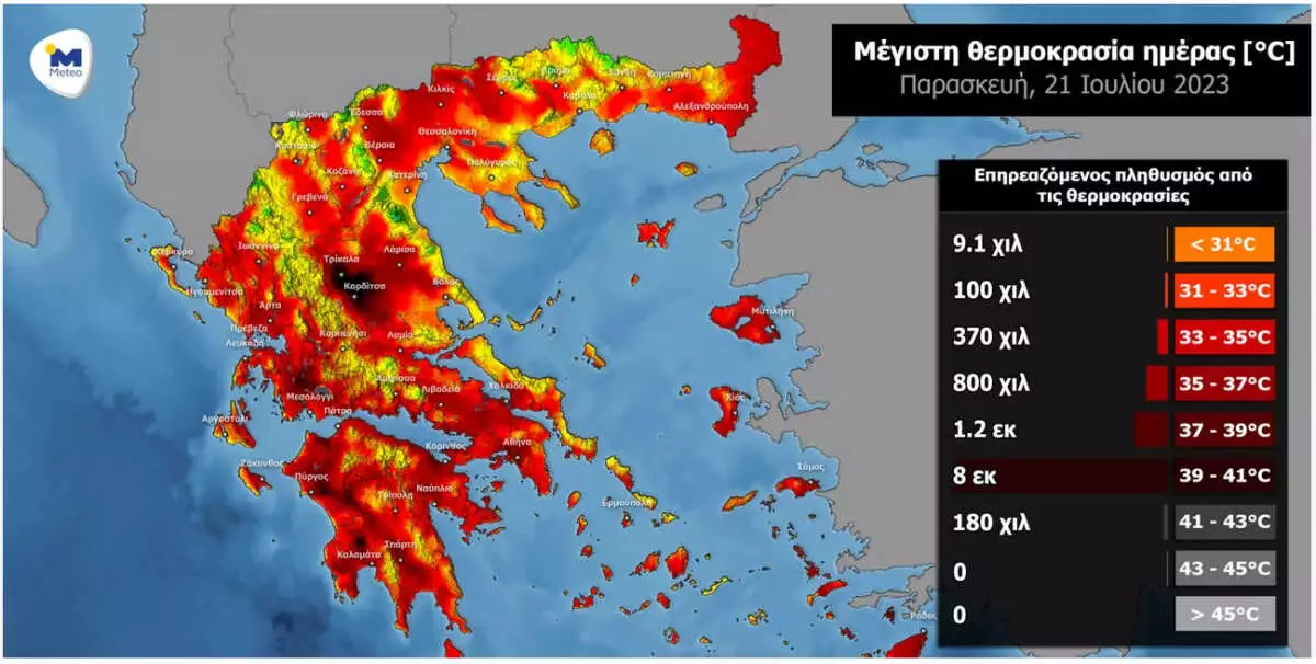 Αυτό θα έχει ως αποτέλεσμα την έκθεση του μεγαλύτερου μέρους του πληθυσμού σε πολύ υψηλές μέγιστες θερμοκρασίες. Όπως φαίνεται στον χάρτη, περίπου 8 εκατομμύρια άνθρωποι αναμένεται να βιώσουν θερμοκρασίες 39-41°C, ενώ περίπου 180 χιλιάδες άνθρωποι θα βιώσουν θερμοκρασίες άνω των 41°C.