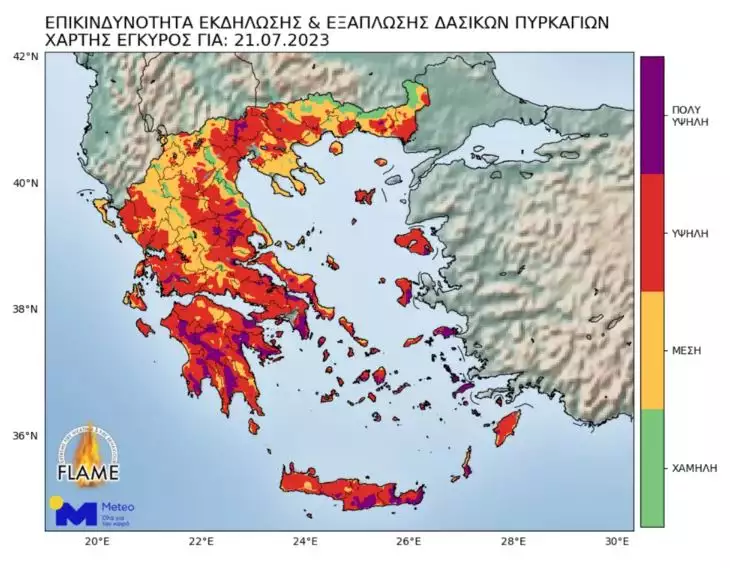 Παράλληλα, με βάση τα προγνωστικά στοιχεία της πυρομετεωρολογικής ομάδας FLAME του Εθνικού Αστεροσκοπείου Αθηνών (ΕΑΑ) / meteo.gr, δυσμενείς πυρομετεωρολογικές συνθήκες αναμένεται να επικρατήσουν σε αρκετές περιοχές της χώρας, και ιδιαίτερα σε τμήματα της ανατολικής και νότιας ηπειρωτικής χώρας και στο Αιγαίο.