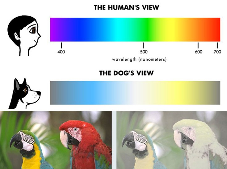 Η οπτική αντίληψη του σκύλου δεν του επιτρέπει μεν να προσλαμβάνει τα χρώματα με τον τρόπο που το κάνει ο άνθρωπος, αυτό δεν σημαίνει ωστόσο ότι τα βλέπει όλα στο φάσμα του γκρι. Μπορεί και διακρίνει τα χρώματα, αν και τα βλέπει σε αποχρώσεις του κίτρινου, του μπλε και του ιώδες. Το πρόβλημα το έχει στο να ξεχωρίσει τα κόκκινα, τα πράσινα και τα πορτοκαλί κι αυτό έχει να κάνει με το πώς διατάσσονται τα ραβδία και τα κωνία στο μάτι του, τα φωτοευαίσθητα κύτταρα του αμφιβληστροειδούς χιτώνα δηλαδή.