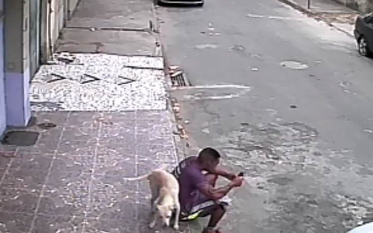 Κάθεται αμέριμνος στο πεζοδρόμιο και ασχολείται με το κινητό του, όταν ένας σκύλος τον πλησιάζει και αποφασίζει κάνει την ανάγκη του πάνω του.