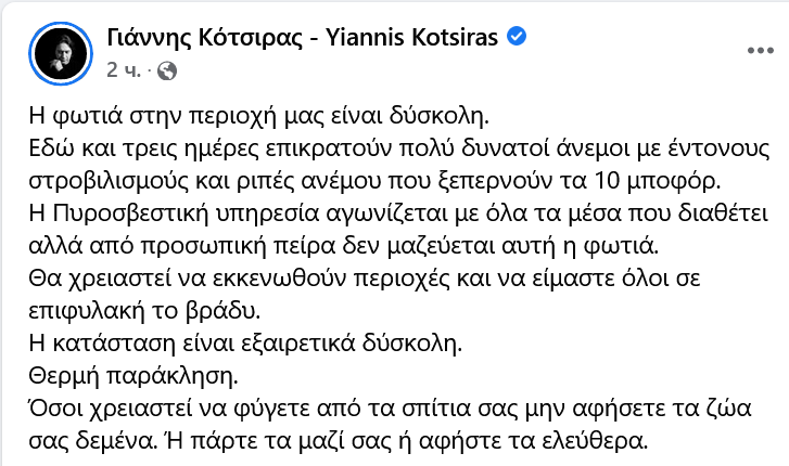 Η κατάσταση είναι εξαιρετικά δύσκολη. Θερμή παράκληση. Όσοι χρειαστεί να φύγετε από τα σπίτια σας μην αφήσετε τα ζώα σας δεμένα. Ή πάρτε τα μαζί σας ή αφήστε τα ελεύθερα» έγραψε ο Γιάννης Κότσιρας.