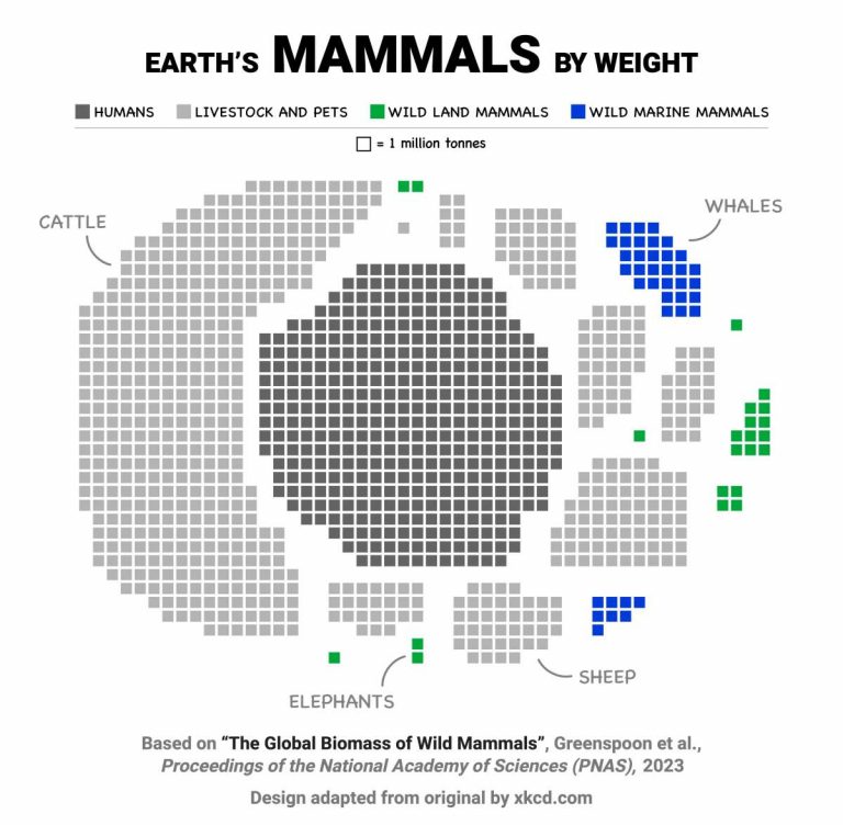 Από τις αρκούδες μέχρι τους μυρμηγκοφάγους και τα καγκουρό, τα άγρια χερσαία θηλαστικά δεν υπερβαίνουν σε βάρος τους 20 εκατομμύρια τόνους, ενώ τα άγρια θαλάσσια θηλαστικά εκτιμώνται σε 40 εκατομμύρια τόνους.