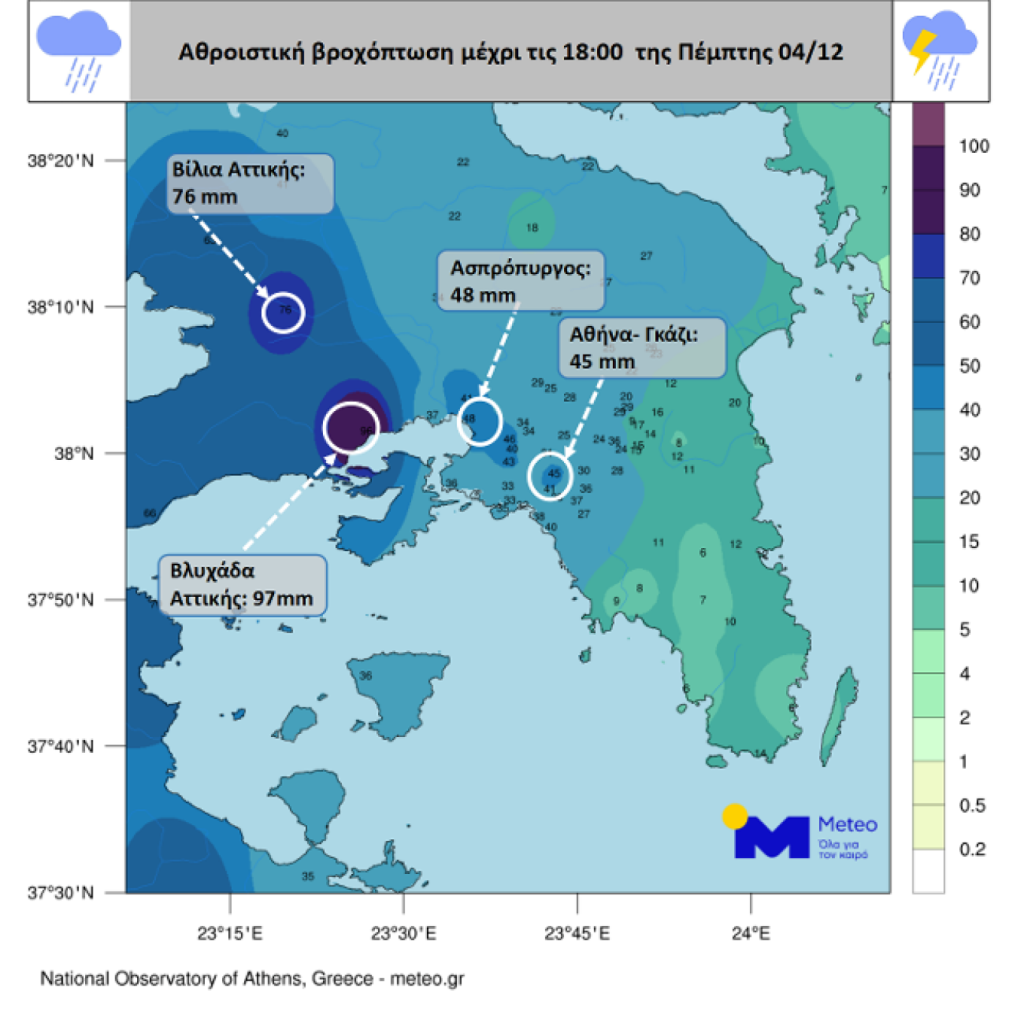 Ειδικότερα, το μεγαλύτερο ύψος βροχής μέχρι και τις 22:00, σημειώθηκε στη Σκάλα Λακωνίας με 136 mm, ενώ ακολουθεί η Βλυχάδα Αττικής με 110.4 mm. Στο Γκάζι καταγράφηκαν 62 mm μέχρι τις 22:00 της Πέμπτης 04/12.